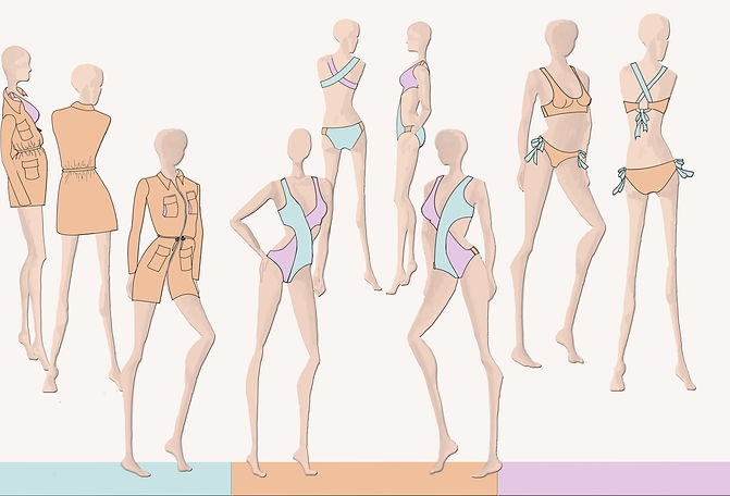 I designed this 3-look swim line for comfort and style. Using a 4-way stretch Lycra for swims allows for maxim mobility and performance. Stretch ratio, coverage, and performance were considered during the development process. Prototypes were constructed and analyzed, adjustments made, and work began on the final garments. The color for the final fabric was achieved using fiber reactive dyes. The straps cross in the back to help distribute pressure on the shoulders and allow for greater arm movement. The Safarka (Safari/Parka Jacket) is a cover-up made of a plain weave nylon material that is quick drying for maximum comfort.